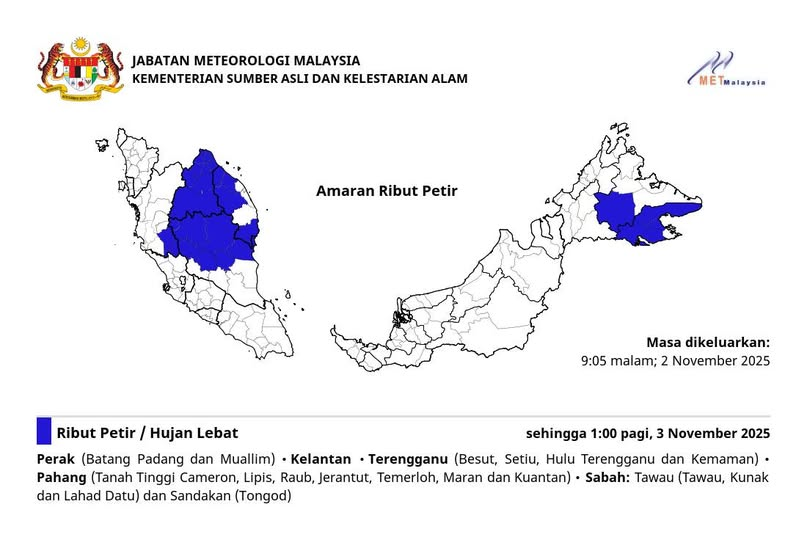气象局发布最新预警——霹雳州(峇登巴丹、慕阿林)、吉兰丹、登嘉楼(勿述、实兆、乌鲁登嘉楼、甘马挽)、彭亨州(金马仑高原、立卑、劳勿、而连突、淡马鲁、马兰及关丹)以及沙巴州(斗湖区的斗湖、古纳、拿笃及山打根区的通滔)预计将出现雷暴、暴雨及强风天气,预警有效至2025年11月3日(星期一)凌晨1时。