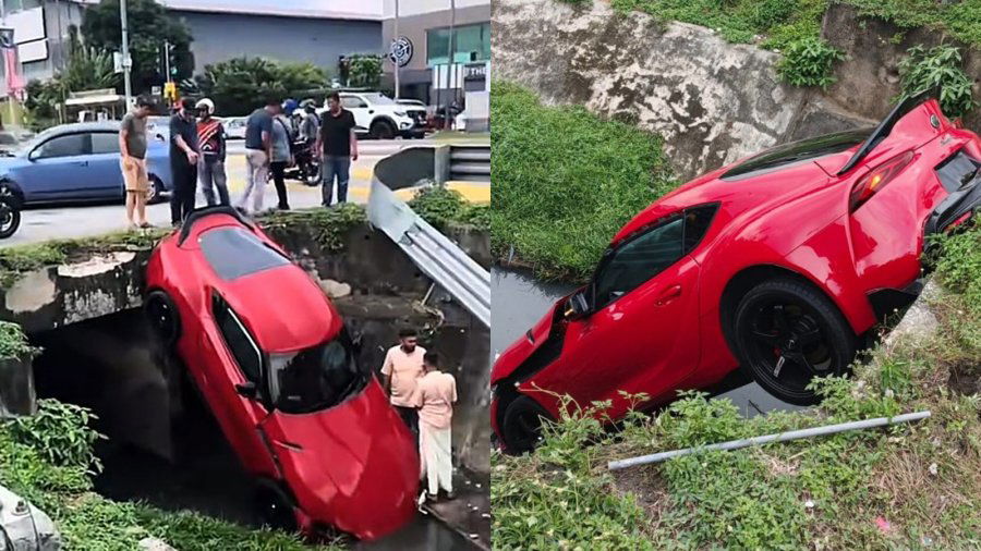 一辆红色丰田 Supra 昨日下午在吉隆坡斯里鹅唛花园路段发生失控冲入路边沟渠的意外,事发前画面显示该车疑因高速贴近并超越前车,引发路人围观与热议。