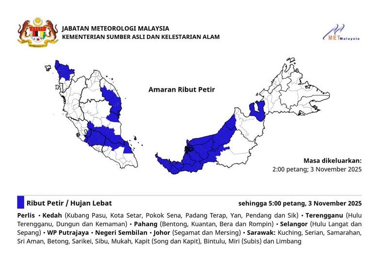气象局今日(2025年11月3日,星期一)发布雷暴预警,预计以下地区将在下午5时前出现雷电交加、豪雨及强风天气: