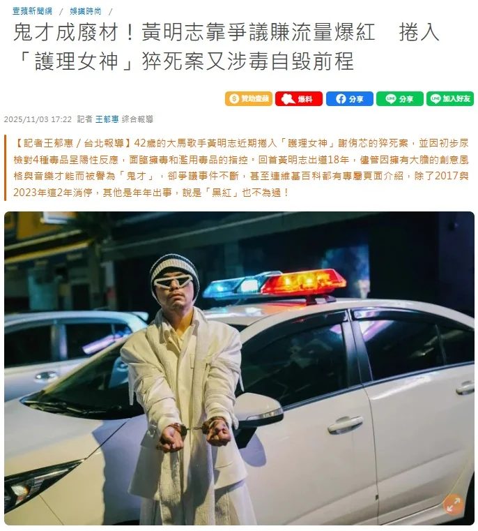 台湾媒体壹苹新闻网报道指,自从2007年因侮辱马来西亚国歌而声名大噪以来,黄明志便一直是争议不断的人物。尽管以大胆的创意和音乐才华被誉为“鬼才”,他的人生与事业却充斥着风波,甚至有专门的维基百科页面介绍其争议历史。除了2017年和2023年较为平静外,其他年份几乎都因各种事件而备受关注。某些人称他为“黑红歌手”,即因负面话题而获得曝光。