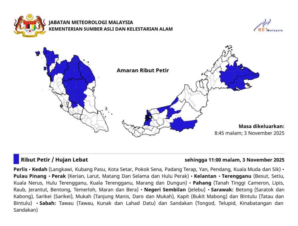 大马气象局今日(11月3日,星期一)发出最新雷暴警报(Amaran Ribut Petir),预料多州将于今晚遭遇雷雨、豪雨及强风,警报有效至晚上11时。