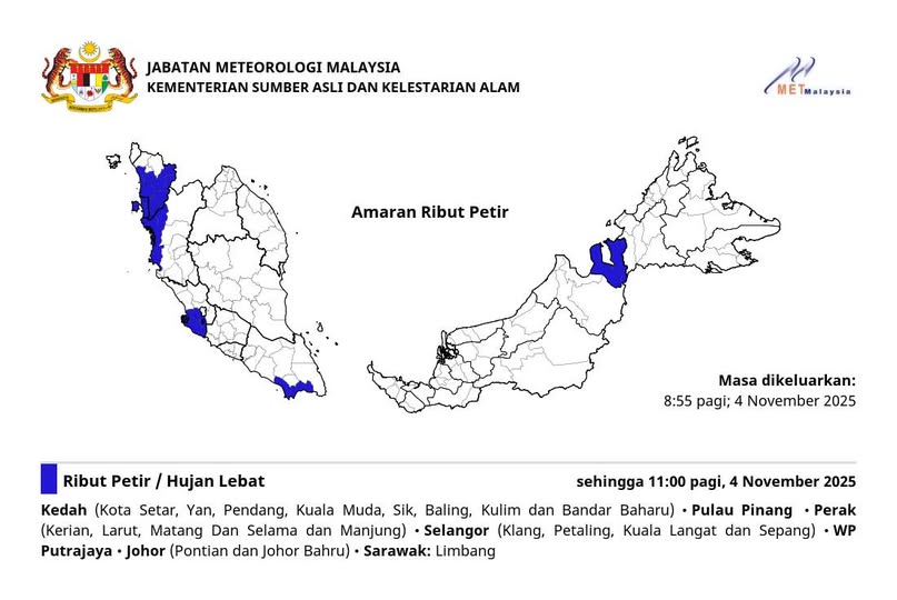 吉打(哥打士打、延、笨筒、瓜拉姆达、昔县、华玲、古林及万拉峇鲁)、槟城、霹雳(吉辇、拉律、马登及仕林、曼绒)、雪兰莪(巴生、八打灵、瓜拉冷岳及雪邦)、布城、柔佛(笨珍及新山)以及砂拉越林梦地区,预计将出现雷暴、暴雨及强风天气,警报有效至2025年11月4日(星期二)上午11时。