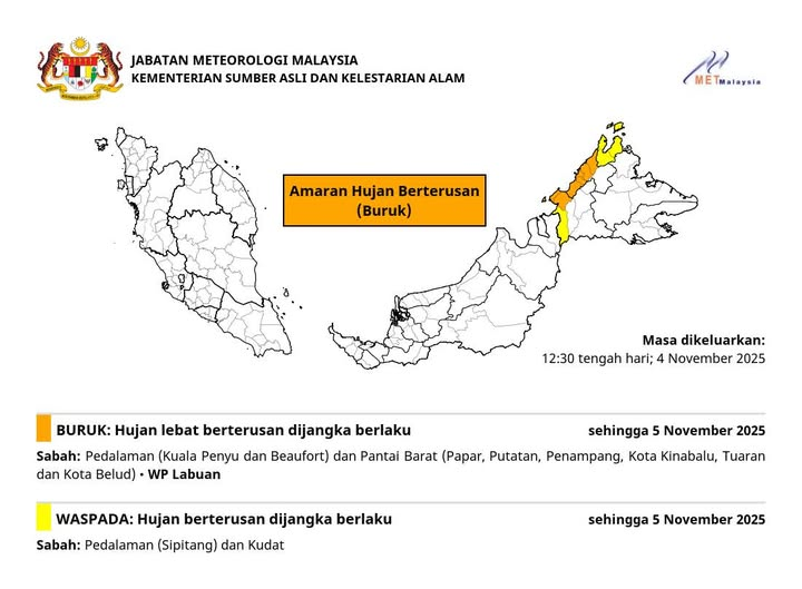 气象局发布警告,沙巴州部分地区预计将出现持续性豪雨,包括: