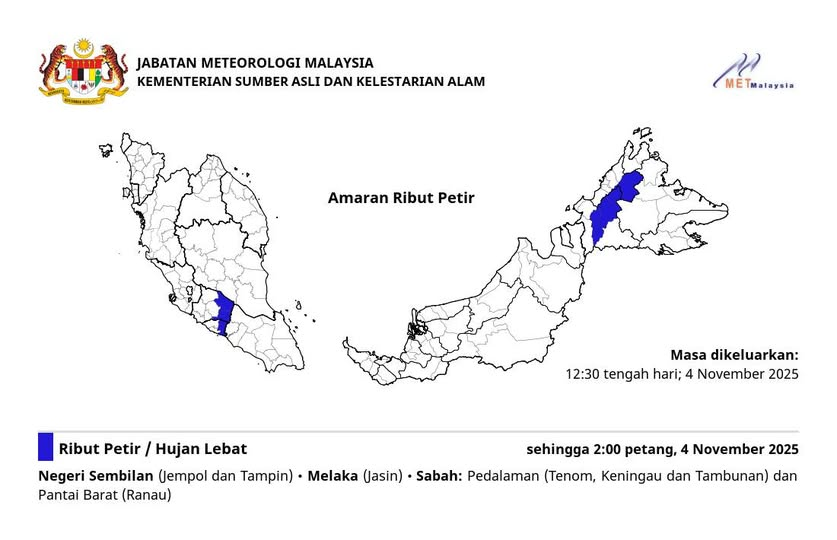 气象局发布最新预警——霹雳交加、豪雨与强风预计将影响以下地区,直至 2025年11月4日(星期二)下午2时: