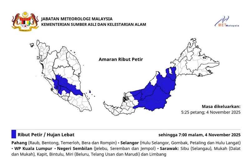 马来西亚气象局(MetMalaysia)今日(11月4日)下午5时25分发布雷暴及豪雨预警,预料受影响地区将持续出现雷雨天气,警报有效至今晚7时。