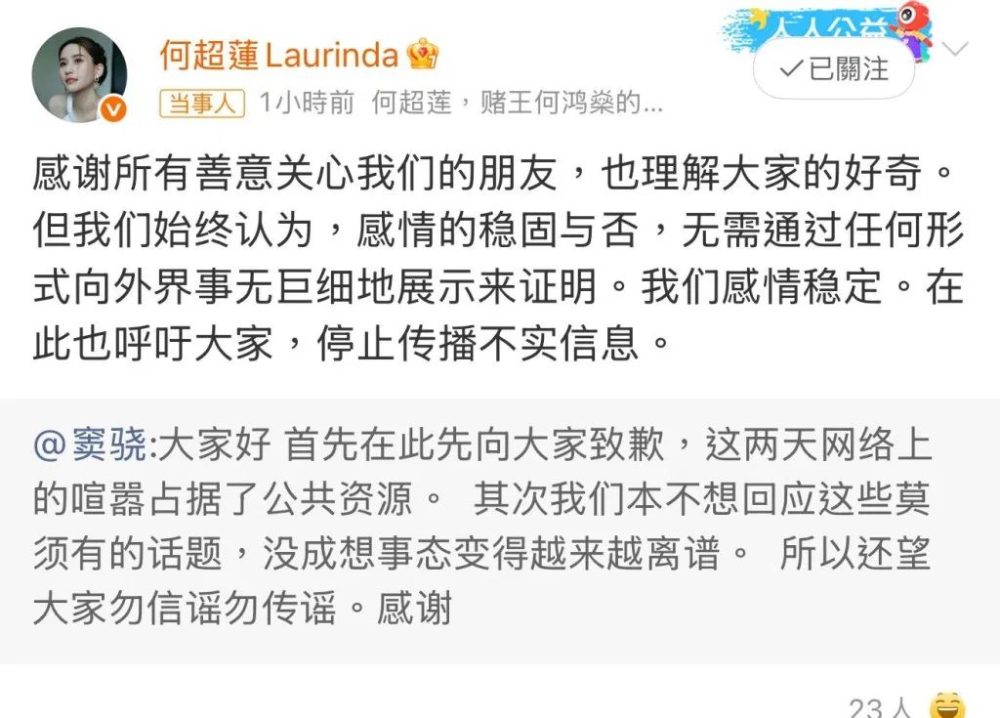 此前,向太曾拍片爆料,称窦骁婚后未获家族支持、夫妻可能闹离婚,引发舆论热议。对此,窦骁在微博发文澄清:“我们本不打算回应这些莫须有的话题,但事态变得离谱。希望大家勿信谣、勿传谣。”何超莲也转发其帖文,表示:“我们感情稳定。”有报道指出,两人目前正计划备孕。
