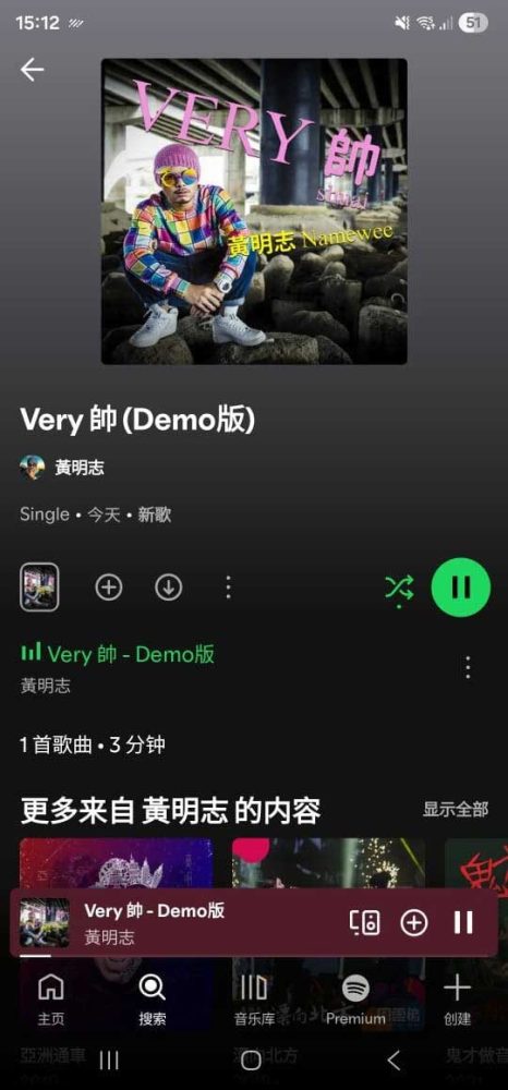记者发现,黄明志的新歌《Very帅-Demo版》在Spotify上显示为今日发布,时长为3分46秒。该歌曲早在2014年就已发布在YouTube上,是黄明志为本地偶像团体屁孩(P-High)创作的作品。