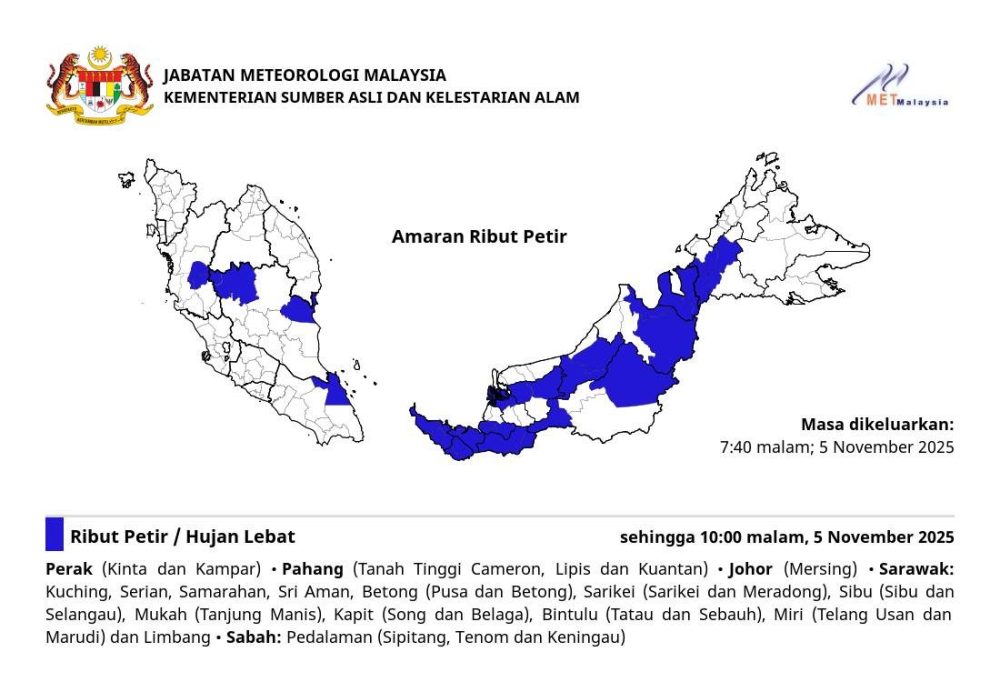 马来西亚气象局于今晚7时40分发布最新雷暴警报,指出霹雳、彭亨、柔佛、砂拉越及沙巴部分地区,预计将出现雷暴、豪雨及强风,警报有效至今晚10时(11月5日,星期三)。
