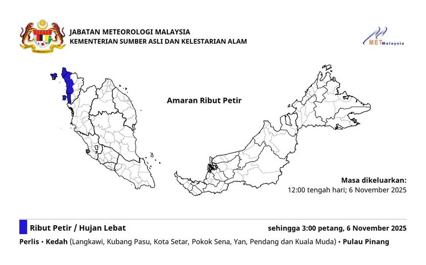 玻璃市、吉打(浮罗交怡、古邦巴素、哥打士打、莪仑、燕、笨筒及居拉木达)以及槟城,预计将在2025年11月6日(星期四)下午3时前出现雷暴、大雨及强风天气。