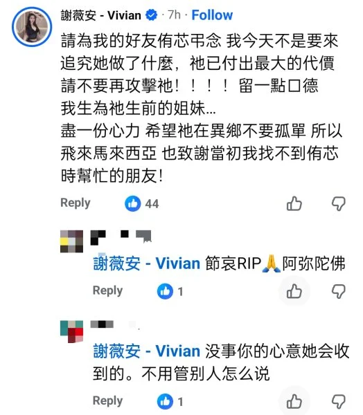 谢薇安于7日凌晨在相关新闻贴文下留言写道:“请为侑芯悼念,我来不是为了追究她做了什么,她已经为此付出了生命。”她呼吁网民停止恶意言论,“请不要再攻击她,留一点口德。