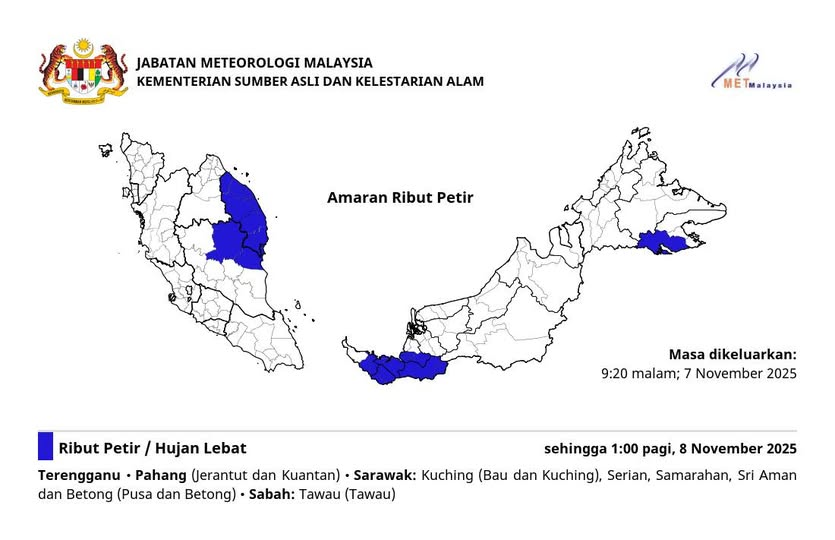 根据气象局发布的最新短期警报,预计登嘉楼、彭亨(热浪与关丹)、砂拉越(古晋、巴鲁、思林、三马拉汉、斯里阿曼及贝东)以及沙巴(斗湖)在今晚至明日凌晨1点可能出现雷暴、大雨及强风。