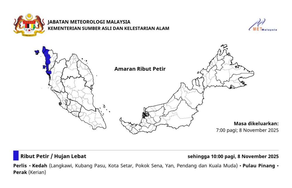 马来西亚气象局今日(11月8日)早上7时发布雷暴预警,指出北马多地预计将出现强烈雷暴、暴雨及阵风天气,影响地区包括玻璃市、吉打(浮罗交怡、古邦巴素、哥打士打、波各先那、日恩、万达、居拉武吉)、槟城及霹雳吉辇县。