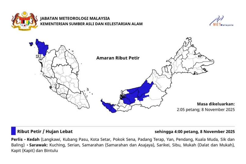 气象局今日(11月8日)下午2时05分发布最新预报,指玻璃市、吉打(浮罗交怡、古邦巴素、哥打士打、波各仙那、巴东得腊、燕、笨筒、居林、锡与华玲)以及砂拉越多地(古晋、实兰沟、三马拉汉〔三马拉汉与阿沙再也〕、泗里街、诗巫、沐胶〔达拉与沐胶〕、加帛〔加帛〕与民都鲁),预计将从即日起至下午4时,出现雷暴、大雨及强风天气。