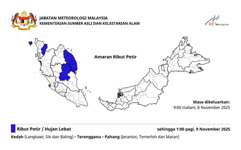 马来西亚气象局(MetMalaysia)发出雷暴警告,预计多个州将遭遇强风暴、暴雨和大风,警告有效时间至2025年11月9日凌晨1点。