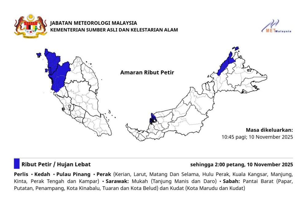 大马气象局今早发布雷暴警报,预料霹雳、吉打、玻璃市、槟城、砂拉越及沙巴部分地区将在今日(11月10日,星期一)下午2时前出现雷暴、豪雨及强风天气。