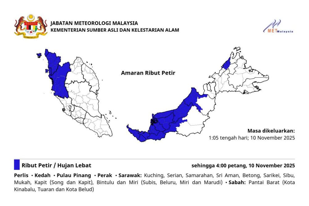 马来西亚气象局今日(11月10日,星期一)下午1时05分发布雷暴警报,预料全国多个地区将在下午4时前出现雷暴、豪雨及强风天气。