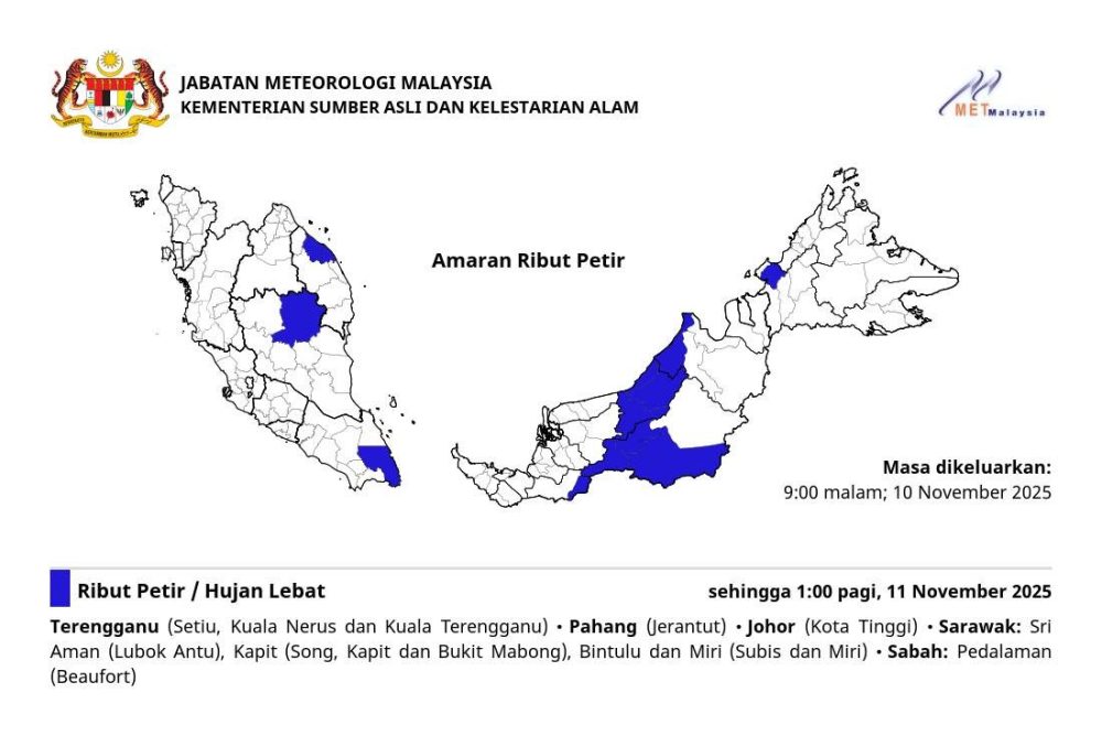 该警报于 11月10日晚上9点发布,请民众注意防范强降雨和雷暴天气,减少户外活动,并确保家中安全。