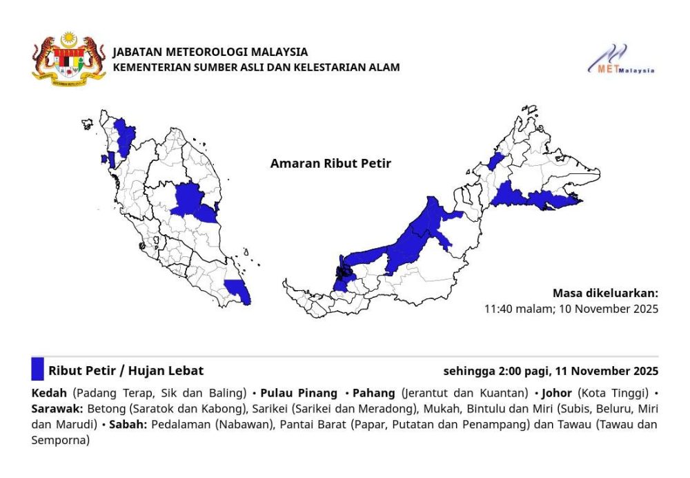 此警告已于 2025年11月10日晚上11:40 发布,民众需保持警觉,避免外出并采取安全预防措施。