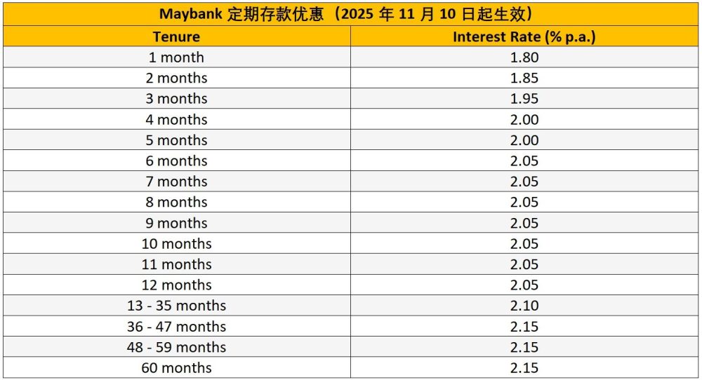 根据马银行(Maybank)官网最新公告,该行已全面下调短期与中长期定期存款(Fixed Deposit)利率。