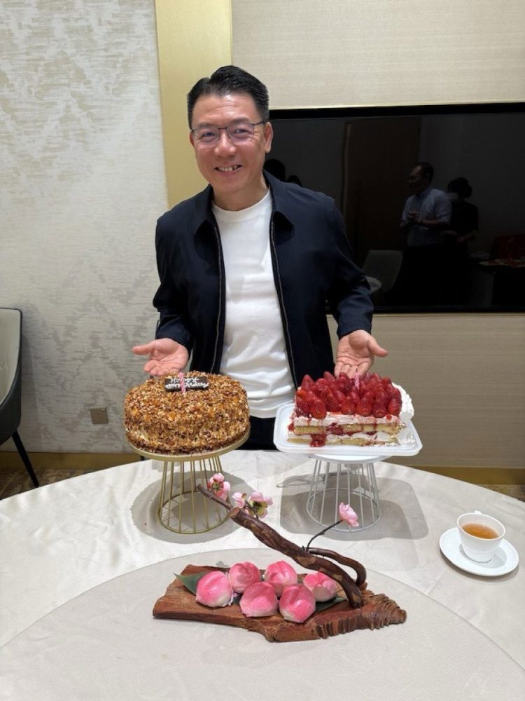 倪可敏也上传照片,图中的桌上摆放著寓意长寿的寿桃、草莓蛋糕与杏仁蛋糕,场面温馨喜悦。