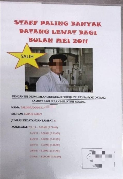 这名男子沙利胡丁在帖文中透露,事件发生于2011年5月,当时他多次上班迟到,但时间都不超过一小时。没想到主管竟突发奇想,为他准备了一张“特别奖状”,上头赫然写着“2011年5月最常迟到员工”。