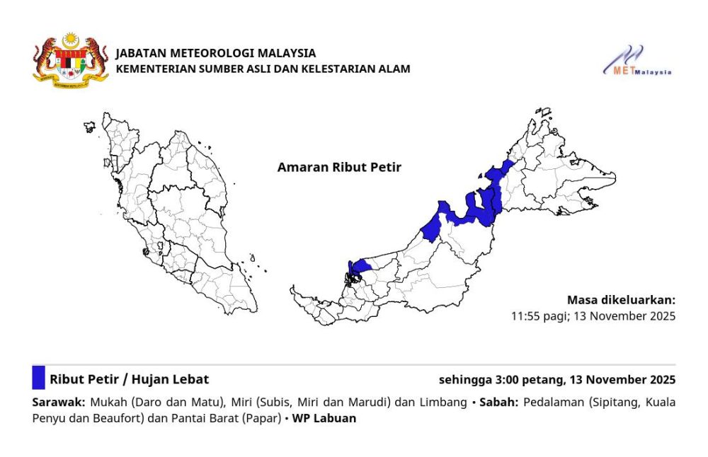 大马气象局今日发出雷暴预警,指11月13日(星期四)多地预计出现雷暴、豪雨及强风,警报有效至下午3时。