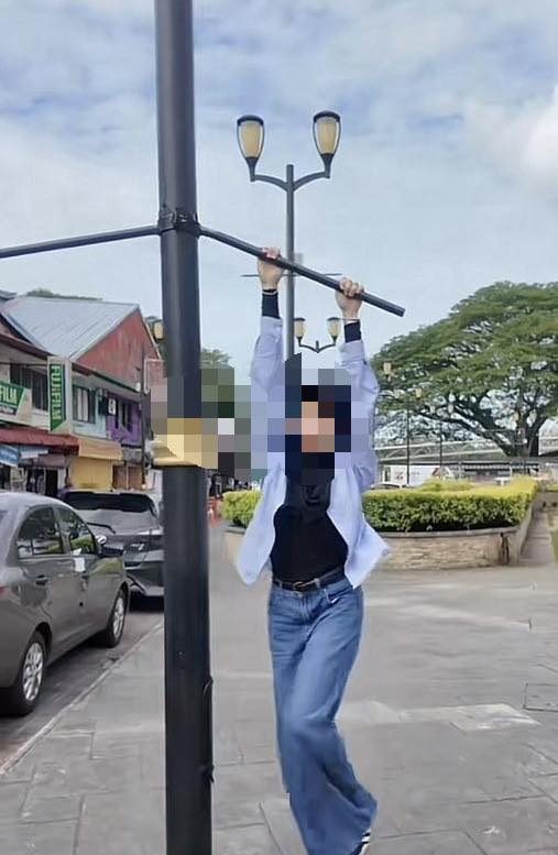 根据视频截图,可见三名年轻人直接抓住路牌与路灯柱往上攀爬,仿佛在进行街头体能表演。市政局指出,这类行为不仅危险,也可能损坏公共财物,严重破坏古晋的市容形象。