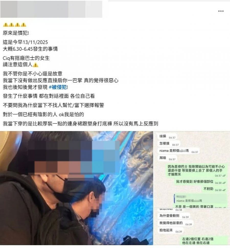 她表示,当时穿着较厚的连身裙与塑身裤,第一时间未能分辨触感,但越想越不对劲,愈发确定自己遭到侵犯。她随后在巴士上拍下该男子容貌,将照片公开,希望提醒其他女性提防。