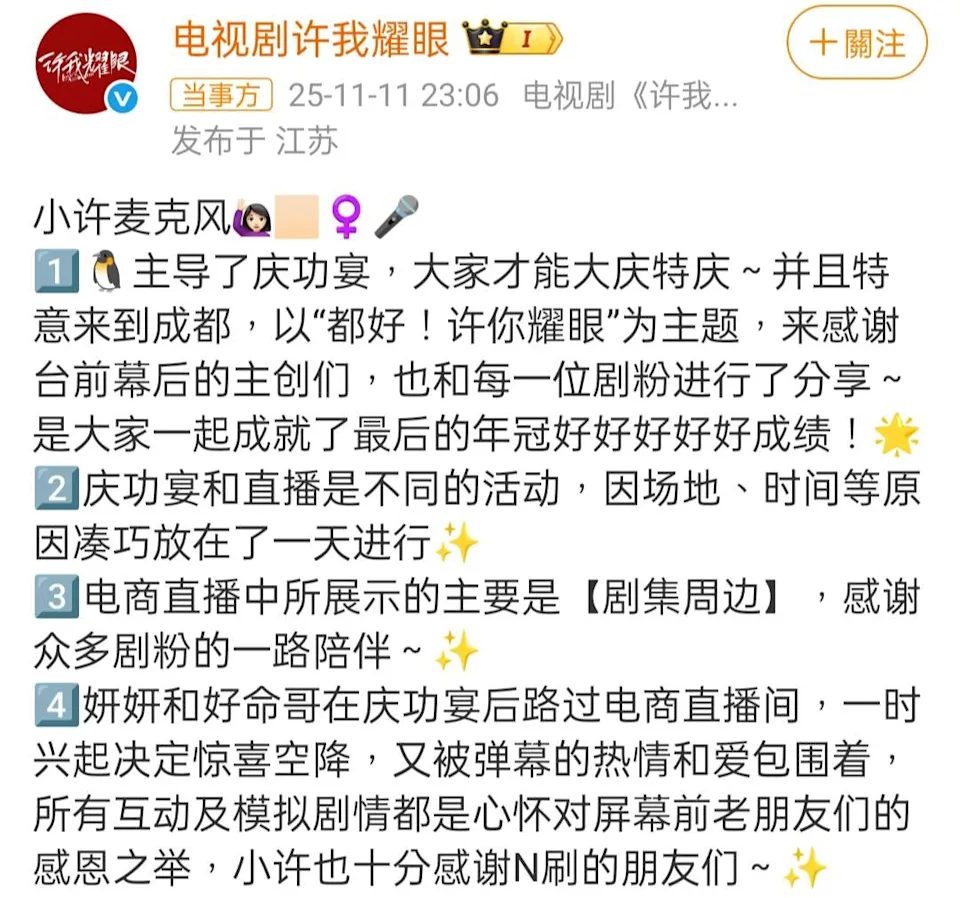 剧组昨(11日)发文澄清,两位演员并非预先安排参与直播,只是即兴露面、想回馈粉丝,否认“割韭菜”说法。声明发布后,不少网友力挺剧组,表示“别再造谣了”“确实有人小题大作”。