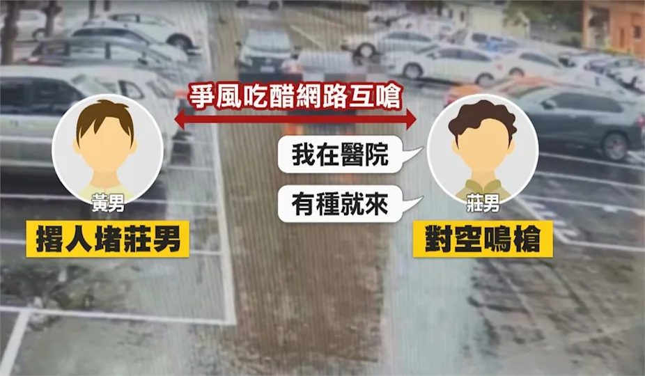 台南两名男子因争风吃醋在网上互呛,其中庄姓男子住院治疗痔疮时竟留言挑衅:“我人在医院,不服来战!”没想到黄姓男子真的带友人赶到医院堵人,双方在停车场狭路相逢,爆发追车、冲撞,现场还传出枪声,吓坏民众。