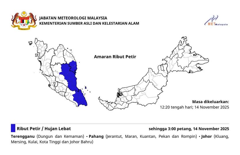 预计 2025年11月14日(星期五)至下午3时,森州 Dungun 与 Kemaman、彭亨 Jerantut、Maran、Kuantan、Pekan、Rompin 以及柔佛 Kluang、Mersing、Kulai、Kota Tinggi、Johor Bahru 将出现强雷暴、暴雨及狂风天气。