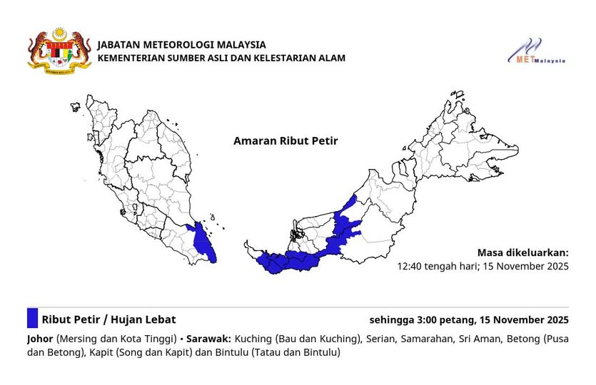 预计柔佛州(美溪与哥打丁宜)及砂拉越州(古晋:包与古晋;斯里阿曼区:色力安、沙马然、斯里阿曼、民都鲁:布东及布东;加帛区:松及加帛;民都鲁区:达陶及民都鲁)将出现雷暴、强降雨及强风,警告有效至2025年11月15日下午3时。