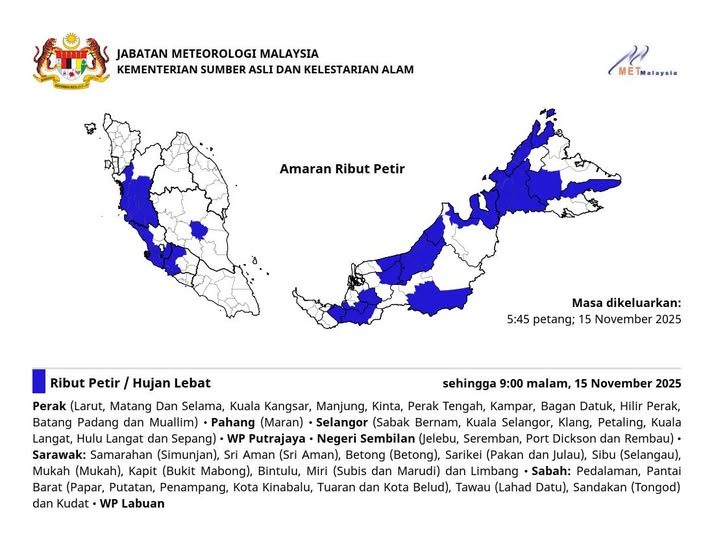 马来西亚气象局(MetMalaysia)于2025年11月15日下午5时45分发布雷暴警告,预计周六(15日)多州将出现雷暴、豪雨及强风天气,警戒至晚上9时。
