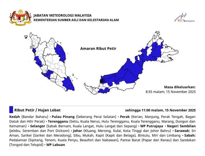 马来西亚气象局发布雷暴警报,预计吉打(Bandar Baharu)、槟城(威南县 Seberang Perai Selatan)、霹雳(Kerian、Manjung、Perak Tengah、Bagan Datuk、Hilir Perak)、登嘉楼(Setiu、Kuala Nerus、Hulu Terengganu、Kuala Terengganu、Marang、Dungun、Kemaman)、雪兰莪(Sabak Bernam、Kuala Langat、Hulu Langat、Sepang)、布城、森美兰(Jelebu、Seremban、Port Dickson)、柔佛(Kluang、Mersing、Kulai、Kota Tinggi、Johor Bahru)、砂拉越(Sri Aman、Sarikei〔Sarikei、Meradong〕、Sibu、Mukah、Kapit〔Kapit、Belaga〕、Bintulu、Miri、Limbang)以及沙巴(内陆:Sipitang、Tenom、Kuala Penyu、Beaufort、Nabawan;西海岸:Papar、Ranau;山打根:Tongod、Telupid)及纳闽联邦直辖区,可能出现雷暴、暴雨及强风。