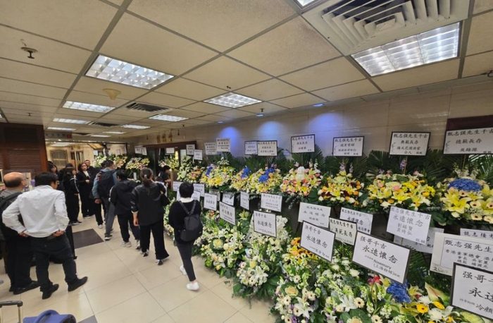 灵堂以白色布置为主,横匾写着“永远怀念”,中央摆放着方心媛以心形花牌致意,并写上“永怀心扉”。厅内花海成片,来自吕颂贤夫妇、江美仪、刘锡贤、林迪安、伍卫国、苑琼丹、陈展鹏夫妇、任达华、黎瑞恩、肥妈、杨玉梅等,足见甄志强生前人缘之好。