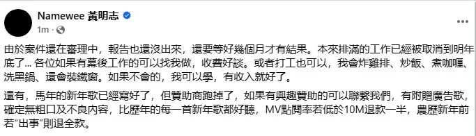 这一帖子立即引发了网友们的热议。黄明志透露,受近期谢侑芯猝死事件的影响,案件尚在审理中,官方报告预计要几个月后才会出炉,导致他接下来的工作几乎全部被取消,收入也因此受到严重影响。