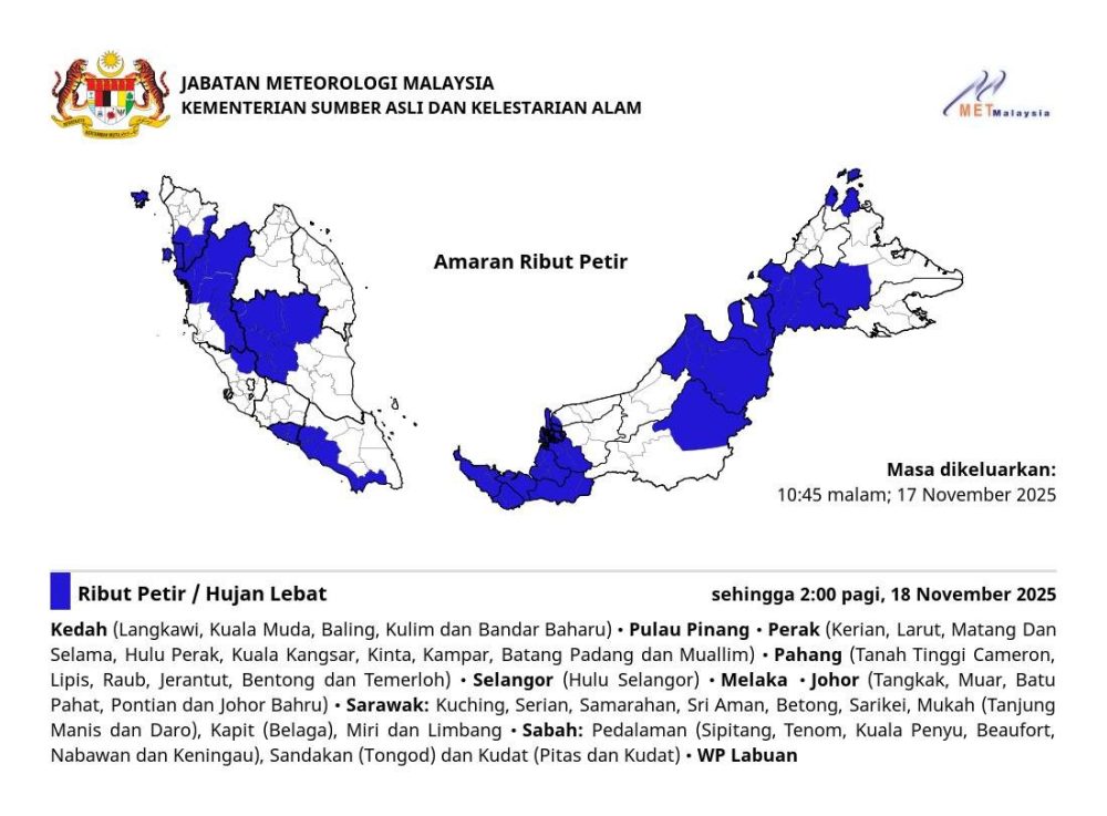 马来西亚气象局已于2025年11月17日晚上10:45发布恶劣天气警报。预计受影响地区将出现雷暴、豪雨(降雨强度超过20毫米/小时)和强风,预警有效期将持续至2025年11月18日(星期二)凌晨2:00。