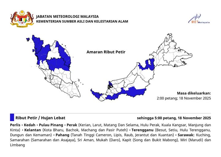 霹雳雷暴、豪雨及强风预计将影响以下地区:玻璃市、吉打、槟城、霹雳州(吉辇、拉律峇登司南马、上霹雳、江沙、曼绒、近打)、吉兰丹(哥打峇鲁、巴西古当、马樟、巴西富地)、登嘉楼(勿述、塞蒂、上登嘉楼、龙运、甘马挽)、彭亨州(金马仑高原、立卑、劳勿、而连突、关丹)、砂拉越(古晋、三马拉汉〔三马拉汉及阿沙再也〕、斯里阿曼、木胶〔达罗〕、加帛〔宋及武吉马汀〕、美里〔马鲁帝〕与林梦)。预警有效至2025年11月18日(星期二)下午5时。
