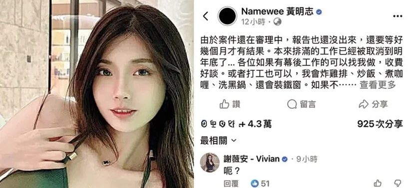 与此同时,谢侑芯的闺蜜谢薇安似乎对黄明志的求职信息不以为然,在黄明志的发文下回复了一个简单的“呃?”字样,似乎对黄明志的近况表示不屑。