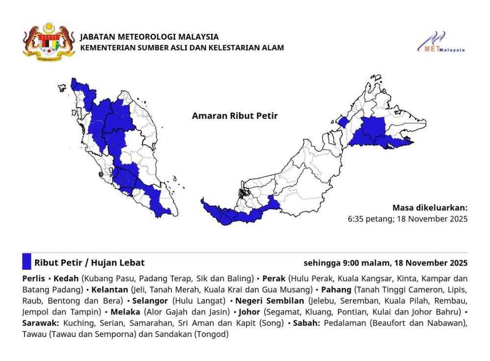马来西亚气象局发布了雷暴警报,预计以下地区将出现强降雨、雷暴和强风天气: