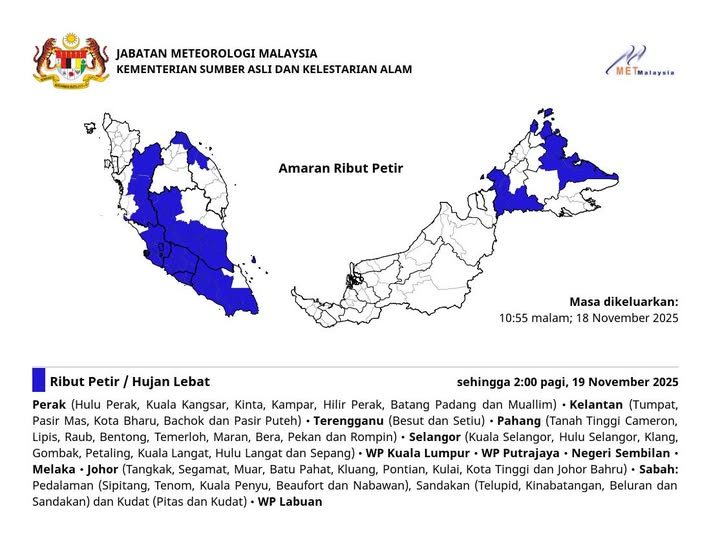 马来西亚气象局(MetMalaysia)于2025年11月18日晚10时55分发布雷暴警报,预料部分州属将出现雷暴、强降雨及狂风,警报有效至11月19日凌晨2时。