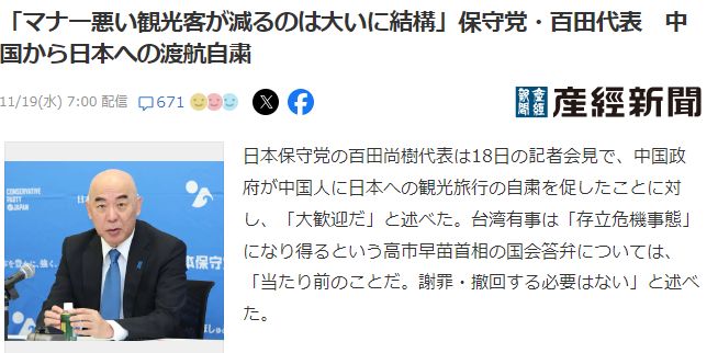 日本保守党党魁百田尚树18日召开记者会,面对中国政府呼吁民众暂缓赴日旅游,他不仅毫不在意,反而直言:“举双手欢迎!”