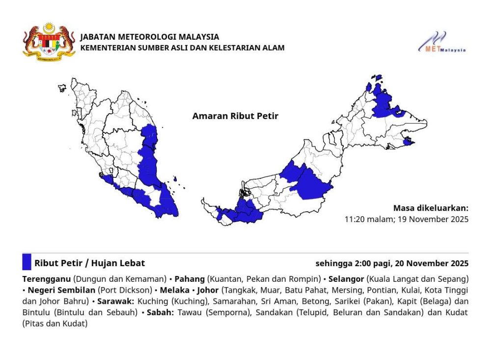 马来西亚气象局于2025年11月19日晚上11:20发布雷暴警告,预计多个州将出现强雷暴、暴雨和强风。具体地区包括: