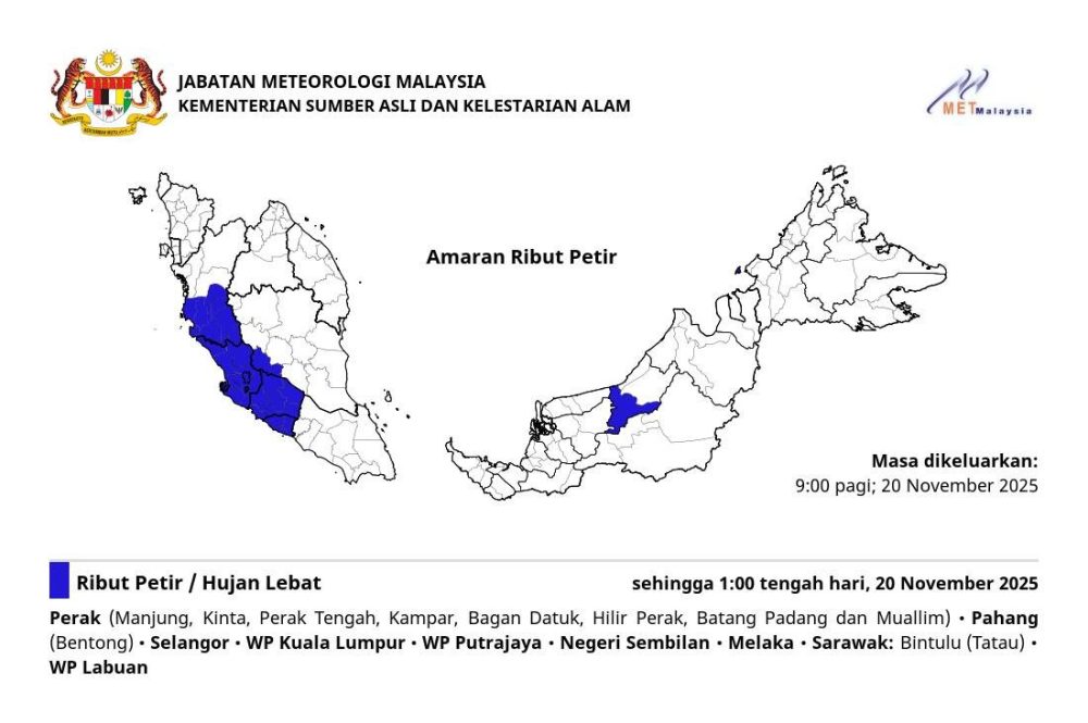 霹雳州(曼绒、近打、中霹雳、金宝、峇眼拿督、下霹雳、峇冬巴辖、木然)、彭亨(文冬)、雪兰莪、吉隆坡联邦直辖区、布城联邦直辖区、森美兰、马六甲,以及砂拉越民都鲁(达岛)和纳闽联邦直辖区,预计将出现雷暴、豪雨及强风天气,警报有效至2025年11月20日(星期四)中午1时。