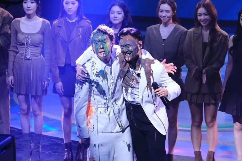 随后登场的“光影传承.薪火对话”音乐剧式表演,由陈豪、谭俊彦、张振朗、高海宁领军,带领何晋乐、梁超仪、邓伊婷、锺晴等后辈,以戏剧方式呈现演员等待机会的心酸。张振朗演唱《我》时直接把颜料泼向林俊其,两人甚至互相“照头淋”,接着搭肩互勉,还互相称对方“王浩信”“张智霖”,引起现场爆笑。