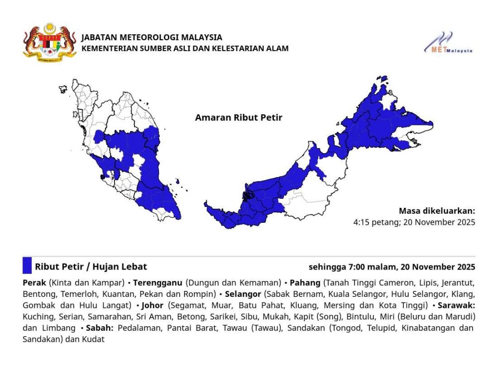 雷暴、豪雨与强风预料将持续至 2025 年 11 月 20 日(星期四)傍晚 7 时。