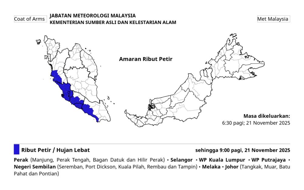大马气象局今早发布雷暴天气预警,指霹雳、雪兰莪、森美兰、马六甲及柔佛部分地区,从清晨起将出现雷暴、豪雨及强阵风,预料将持续至今早9时(11月21日,星期五)。