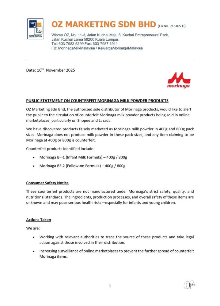 OZ Marketing 重申,他们将继续与当局合作,全力维护消费者权益,确保市场上的森永奶粉皆为安全、合规的正品。