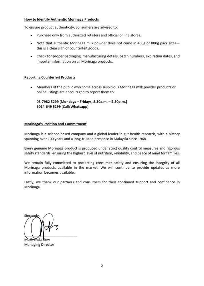 Morinaga 森永奶粉在马来西亚的独家总代理 OZ Marketing 私人有限公司 发出严正声明,强调森永从未生产,也未授权任何 400克或 800克包装 的奶粉产品,凡是以该规格出售者 一律是假货。