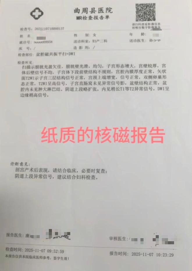 产妇娇娇(化名)在社交平台指出,9月18日剖腹产出院后,她一直觉得身体不对劲,却以为是术后恢复过程。直到11月7日晚,她在清洗下体时摸到异物,第二天到曲周县医院检查,盆腔磁共振结果显示阴道上段存在异常,随后医生竟从体内取出一块已经发臭的纱布。